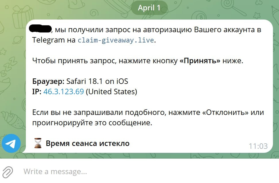 Мошенники начали охоту за аккаунтами, которые используют анонимные номера в Telegram. Пользователи получают уведомления на авторизацию через сайт claim-giveaway.live. И если случайно принять разрешение на доступ, то можно лишиться конфиденциальной информации или же вовсе — потерять аккаунт.