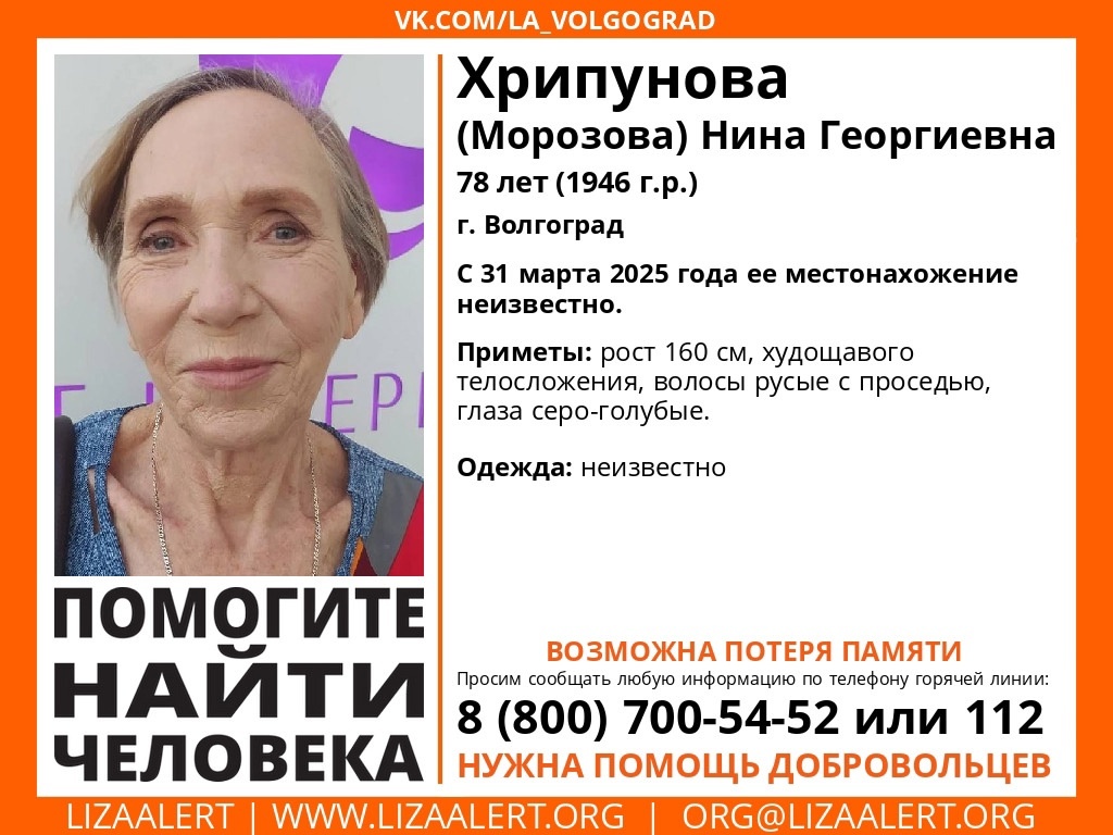 В Волгограде пропала без вести 78-летняя Нина Хрипунова. Подробности «Блокноту» сообщили родственники женщины. По словам внучки, бабушка вышла из дома в Дзержинском районе 31 марта около 18 часов и не вернулась. Все произошло в частном секторе на Каче в районе улицы Житкурской. Ситуация осложнена тем, что пожилая женщина страдает потерей памяти — у нее развивающаяся деменция. — Бабушка из дома далеко никогда никуда не выходит в связи с проблемами с памятью, но с физическим здоровьем все в порядке. Скорее всего, вышла прогуляться по близлежащим улицам частного сектора, — рассказала внучка. Родственники подали заявление в полицию и связались с поисковым отрядом «Лиза Алерт». Все это время они также пытались найти Нину Георгиевну своими силами. Поиски вместе с отрядом продолжались с полуночи до 5 утра, но пока не принесли результатов. Ранее в Волжском за несколько дней пропали сразу двое мужчин. Волонтеры ищут пропавшего без вести 43-летнего Игоря Албутова. Мужчина ушел из дома еще 14 ма
