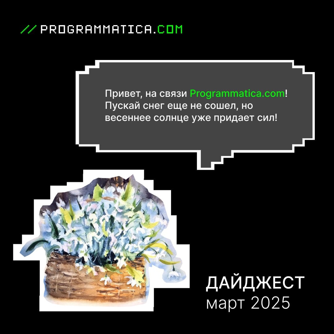 🎨 Мартовский дайджест Programmatica.com Мы заметили, что солнце все чаще заглядывает в офис, а после работы уже не так темно. Остальные новости за этот месяц уже рассказали на нашем сайте! Кстати, чтобы получать свежие новости и анонсы digital-мероприятий на почту, подписывайтесь на рассылку Programmatica.com 💚 У тебя спина белая! ❤️ — Ностальгия в глаз попала 💅 — Ищите другого дурачка 🤣 — Единственный день в году, когда мое поведение оправдано #дайджест ПОДПИСАТЬСЯ | @programmatica_com