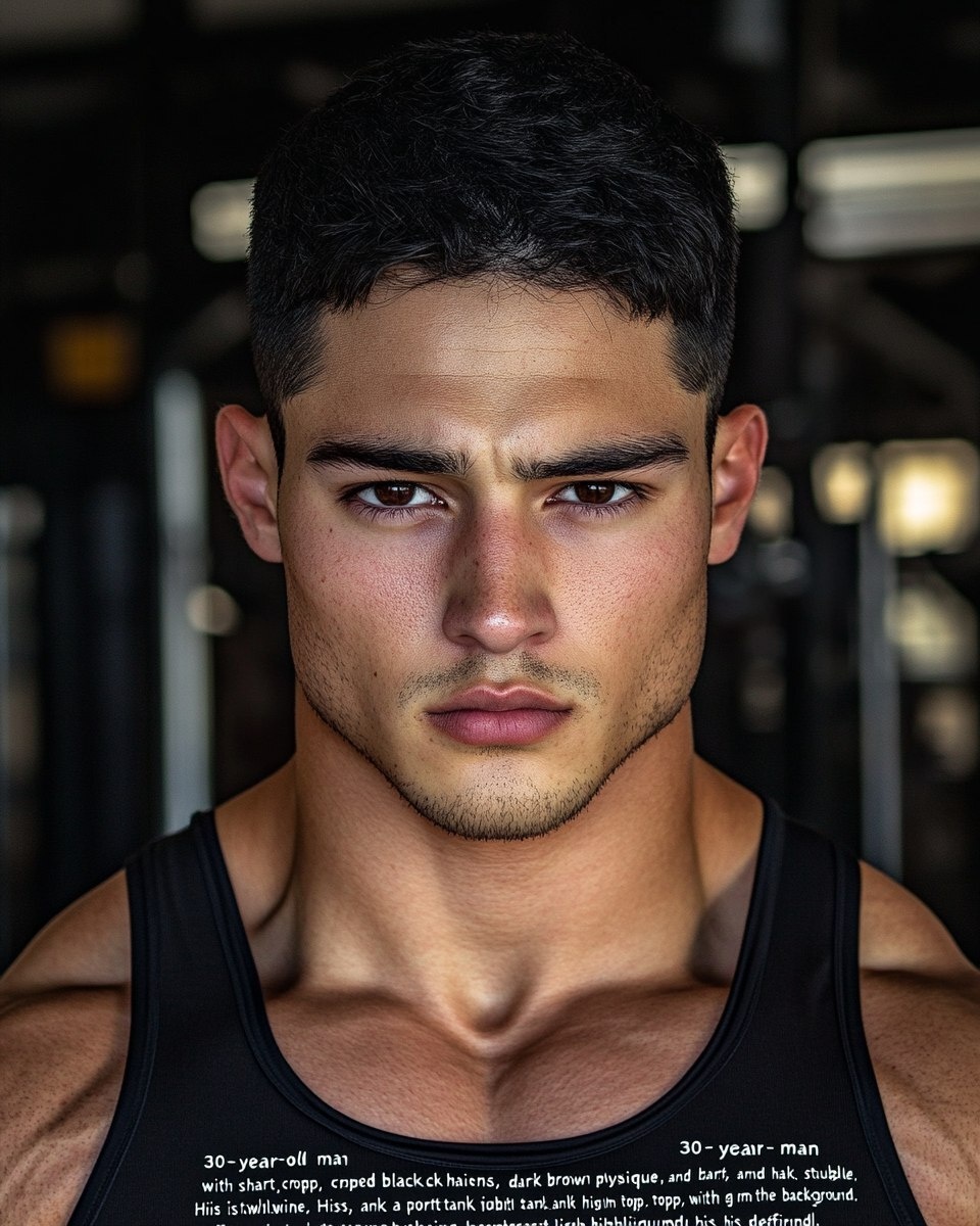 Создано на основе запроса: "A 30-year-old man with short, cropped black hair, dark brown eyes, and a muscular physique