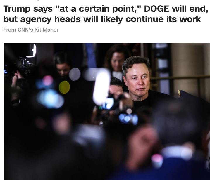 CNN сообщает, что Трамп намекнул на скорый уход Илона Маска из Белого дома, где он занимался программой по улучшению работы правительства США (DOGE). Трамп считает, что Маску пора вернуться к своим "большим компаниям" и что DOGE выполнила свою задачу и скоро будет закрыта. https://sobcor.news/01042025/8404/ Анализируй в ВК Узнавай новости в ОК Смотри видео в youtube Подписывайся на новости без цензуры в Телеграм Интересные видео в Rutube