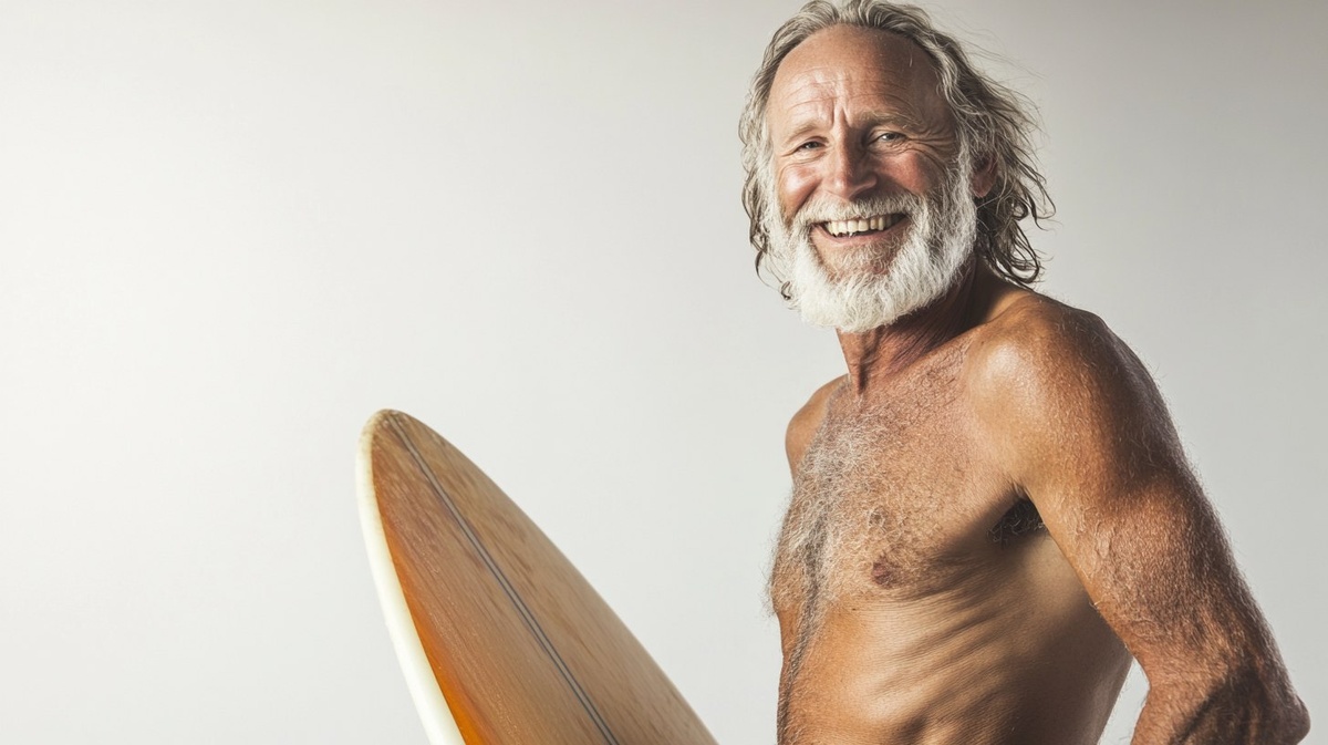 Создано на основе запроса: a full body portrait of an eldery surfer man, smiling, holding a board and looking into camera, advertising