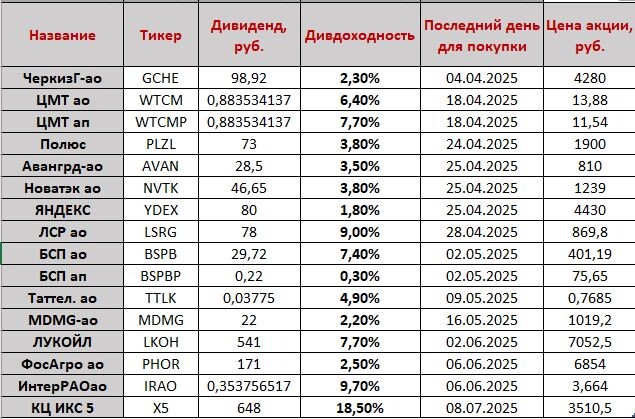 📄 Актуальная дивидендная таблица🤩 Приближается самый крупный на российском рынке дивсезон, в котором компании поделятся с акционерами прибылью за IV квартал 2024 и весь прошлый год. Мы активно отслеживаем корпоративные новости, касающиеся предстоящих выплат. Покупка акций под дивиденды или с целью продажи в тот момент, когда дивдоходность максимально будет заложена в стоимость, — хорошо зарекомендовавшие себя тактики. В таблице собрана информация по дивидендам, которые уже утверждены Советом директоров соответствующей компании. Дивдоходность рассчитана, исходя из отношения размера предстоящей выплаты к текущей рыночной цене акции. Фактической датой отсечки является дата «Т-1» (на два рабочих дня ранее даты закрытия реестра акционеров). Этот последний день, когда можно купить акции, чтобы получить дивиденды, обозначен в графе «Последний день для покупки». Как правило, на следующий день акции падают в цене на размер выплаты. Среди стратегий доверительного управления ИК Fontvielle м