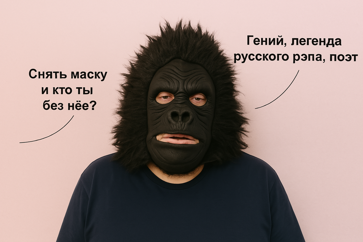 Паша Техник прославился своим фирменным атрибутом – маской гориллы, в которой выступал на ранних концертах. На иллюстрации иронично обыгрывается вопрос: «Снять маску – и кто ты без неё?», на что следует ответ: «Гений, легенда русского рэпа, поэт». Контраст между эпатажной маской и реальным талантливым артистом отражает суть феномена Паши Техника – шокирующий образ сочетается с уважением к нему как к культовой личности.