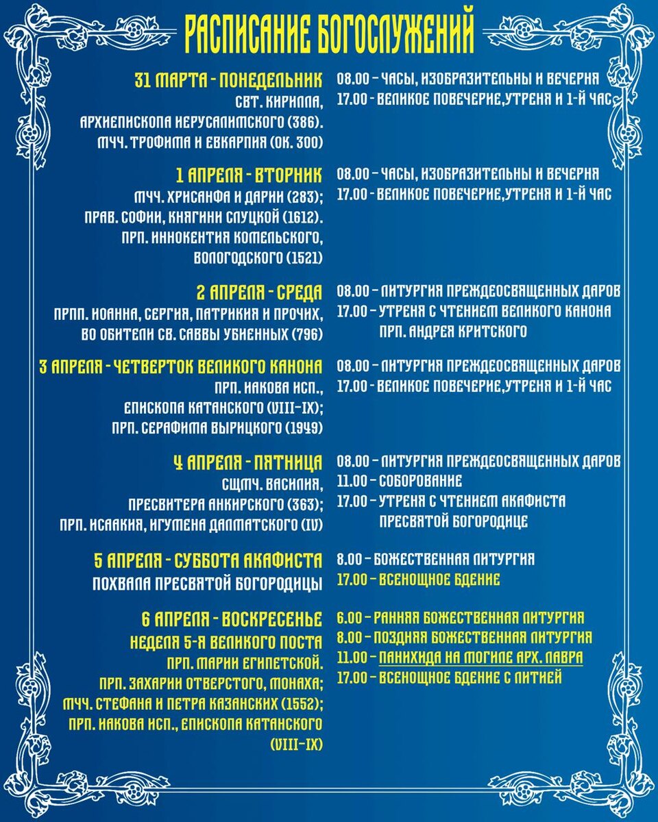 Расписание богослужений 31.03.2025 - 06.04.2025 Дорогие братья и сестры! Пожалуйста, обратите внимание, что на этой седмице Литургия Преждеосвященных Даров совершается в среду, четверг и пятницу. В среду, 2 апреля в 17:00, будет совершаться Утреня с чтением Великого канона прп. Андрея Критского. В пятницу, 4 апреля: - в 11:00 соборование; - в 17:00 Утреня с чтением Акафиста Пресвятой Богородице. В воскресенье, 6 апреля - две Божественных литургии в 6:00 и 8:00, после которых, в 11:00 на могиле строителя и первого игумена обители, архимандрита Лавра, в 7-ю годовщину его преставления, будет совершено заупокойное богослужение.