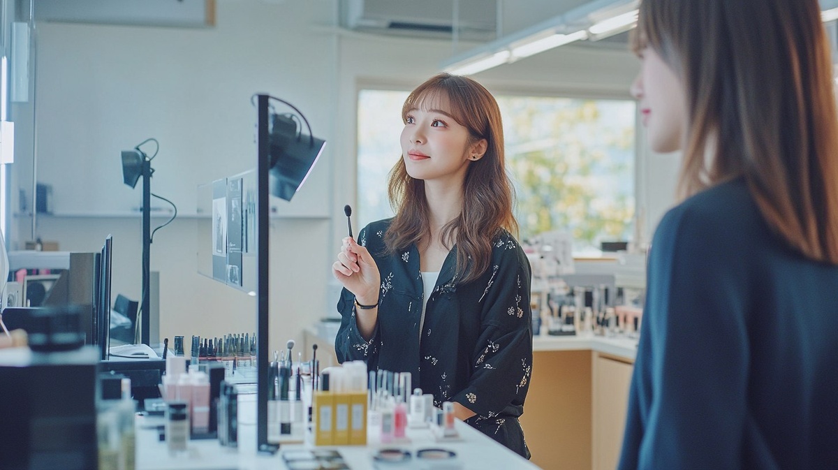 Создано на основе запроса: Japanese beauty school classroom, fashionable female beauty student teaching makeup techniques to high school