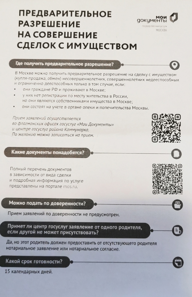 Список документов, необходимые для получения предварительного разрешения органов опеки (Москва) на продажу недвижимости, где у несовершеннолетнего есть доля (или всё в собственности). Вчера ездила с флагманский МФЦ (только в таком можно подавать заявление в опеку) и консультант устно озвучила список документов. Также дала памятку, в которой есть полный список документов (открывается при наведении камеры телефона на Q-код). Этот список не содержит и половины того, что сказала консультант. ✅ Специалист заверила, что для подачи заявления не нужно прикладывать план БТИ и экспликацию к нему (на сайте Домклик есть в списке). ✅ На основании вчерашней информации, составила перечень документов. От себя перестраховалась и добавила п.6, всё равно для сделки нужно. Документы: 1. Заявление родителей (в МФЦ оба должны присутствовать) 2. Паспорта родителей 3. Свидетельство о рождении ребенка 4. Письменное мнение ребенка в возрасте от 10 до 14 лет (произвольная форма) 5. Правоустановливающие документы