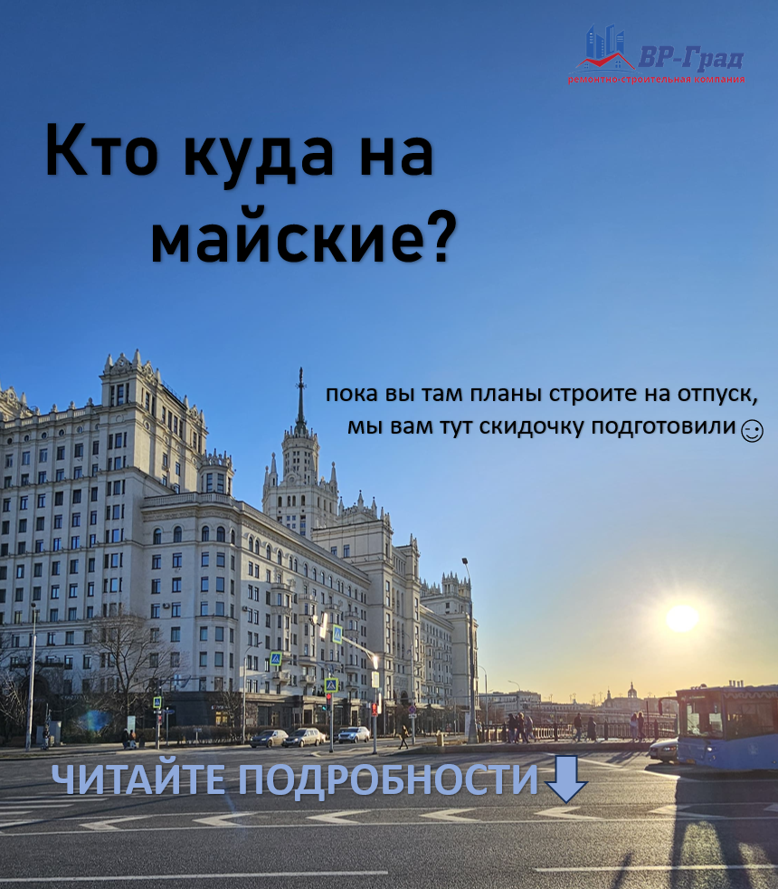 Пока вы планируете выходные или отпуск, мы подготовили вам скидку на ремонт! Вы отдыхаете - мы ремонтируем!🤗 С 1 апреля по 31 мая действует скидка на комплексный ремонт квартиры или отдельного помещения - 1️⃣5️⃣% и это не первоапрельская шутка. Вы спокойно занимайтесь подготовкой к отпуску, или едьте в отпуск, а мы все сделаем! Мы предоставим вам регулярный отчет о проделанной работе (фото/видео), подробная смета, поэтапная оплата, гарантия на работы 3 года, все как вам удобно! Оставляйте заявку на замер на сайте⬇️ https://vrgrad.ru/