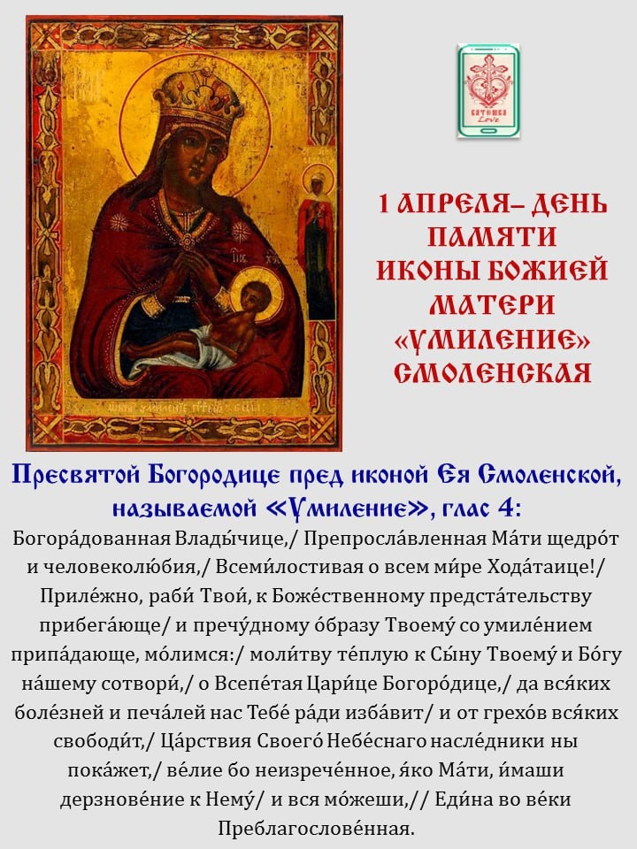 Смоленская икона Божией Матери, именуемая «Умиление», явилась в 1103 году в Смоленске. Этот образ сыграл особую роль в период обороны Смоленска от польских захватчиков в начале XVII века. Икона находилась в стане русских войск, 18 мес удерживавших неприятеля от разграбления города.