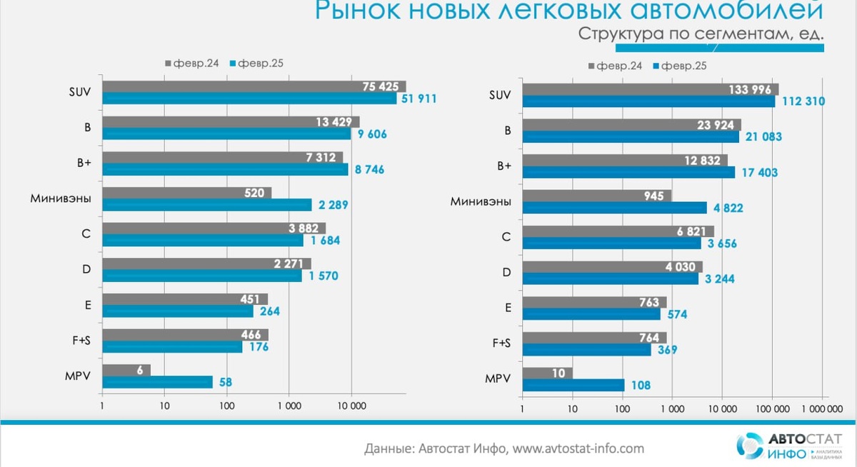 Сегменты В и В+, традиционно популярные среди российских автолюбителей, в феврале 2025 года заняли второе место по объему продаж с долей в 24% (18 352 единицы). Однако годом ранее было продано на 12% больше машин этих классов (20 741 единица).