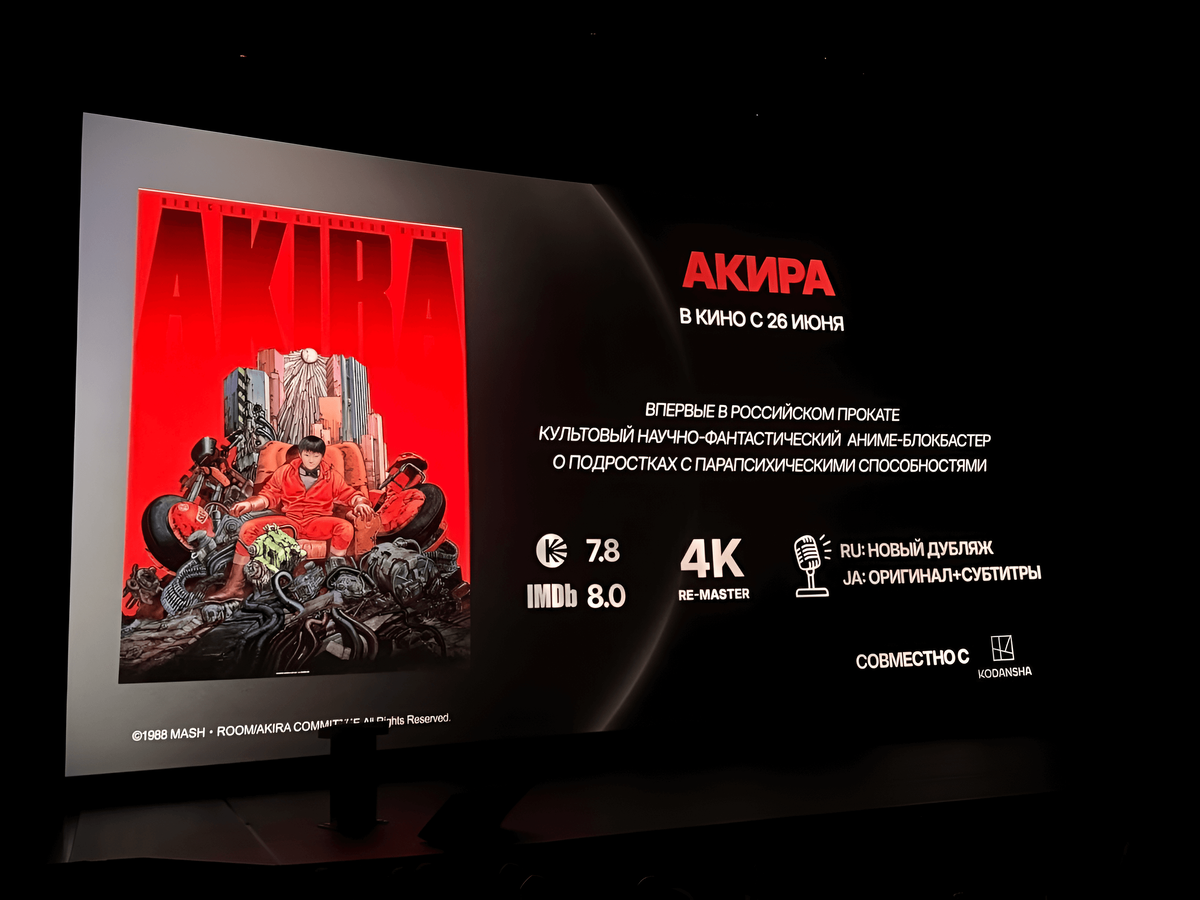 В российских кинотеатрах готовится настоящий прорыв — культовые «Акира» и «Призрак в доспехах» выйдут на большой экран в отреставрированном 4K качестве. Раньше «Акиру» можно было увидеть на «Первом канале» 8 декабря 2007 года, а большинство поклонников знакомы с его легендарной историей.