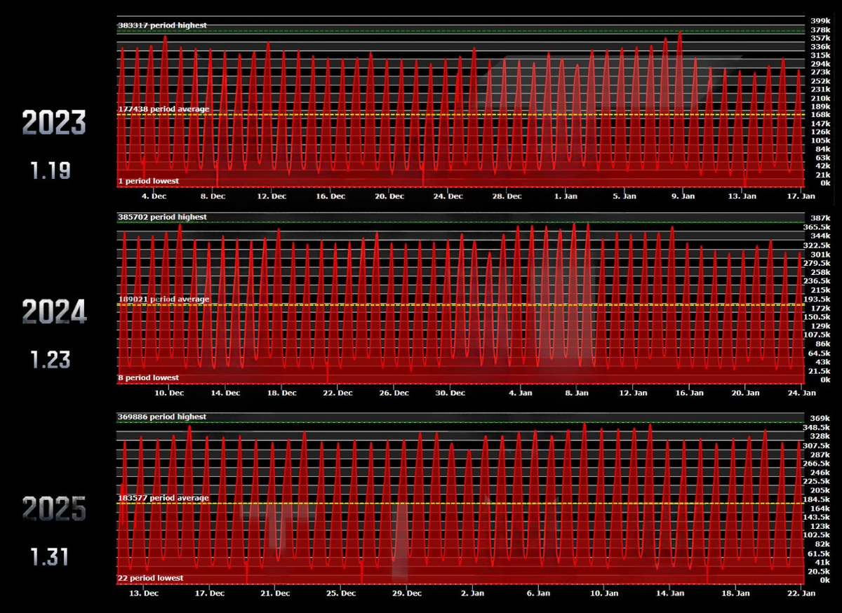 Давайте же посмотрим на первый график, где сравниваются обновления 2023, 2024, 2025 годов, это обновления 1.19, 1.23, 1.31. Обновление 2025 года не Альфа, но зато это Новогоднее обновление, которое обычно притягивает очень много игроков в игру! Что же мы имеем по цифрам: