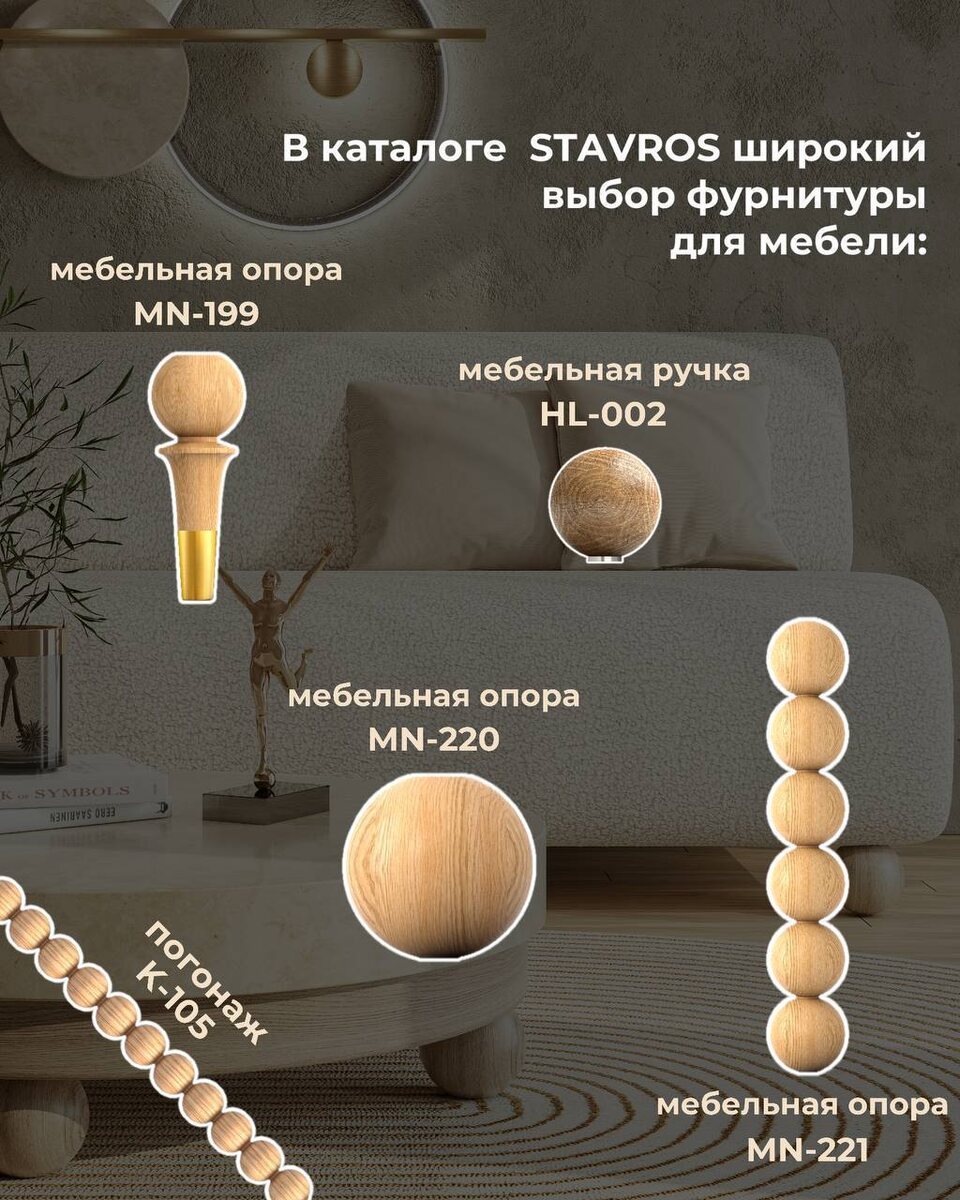 Подготовили для вас подборку стильной фурнитуры и декора в форме шара — одного из самых актуальных трендов в мебельном дизайне. MN-199 – эффектное сочетание дерева с металлом. Высота 195 мм идеальна для комодов и тумб. HL-002 – лаконичная ручка-кнопка диаметром 44 мм для распашных и выдвижных фасадов. MN-220 – устойчивая монолитная ножка для диванов, пуфов и журнальных столов. К-105 – резной погонаж шириной 9 мм для изысканных акцентов. MN-221 – эффектная опора из нескольких шаров высотой от 429 до 740 мм. Оформить заказ на сайте >>>