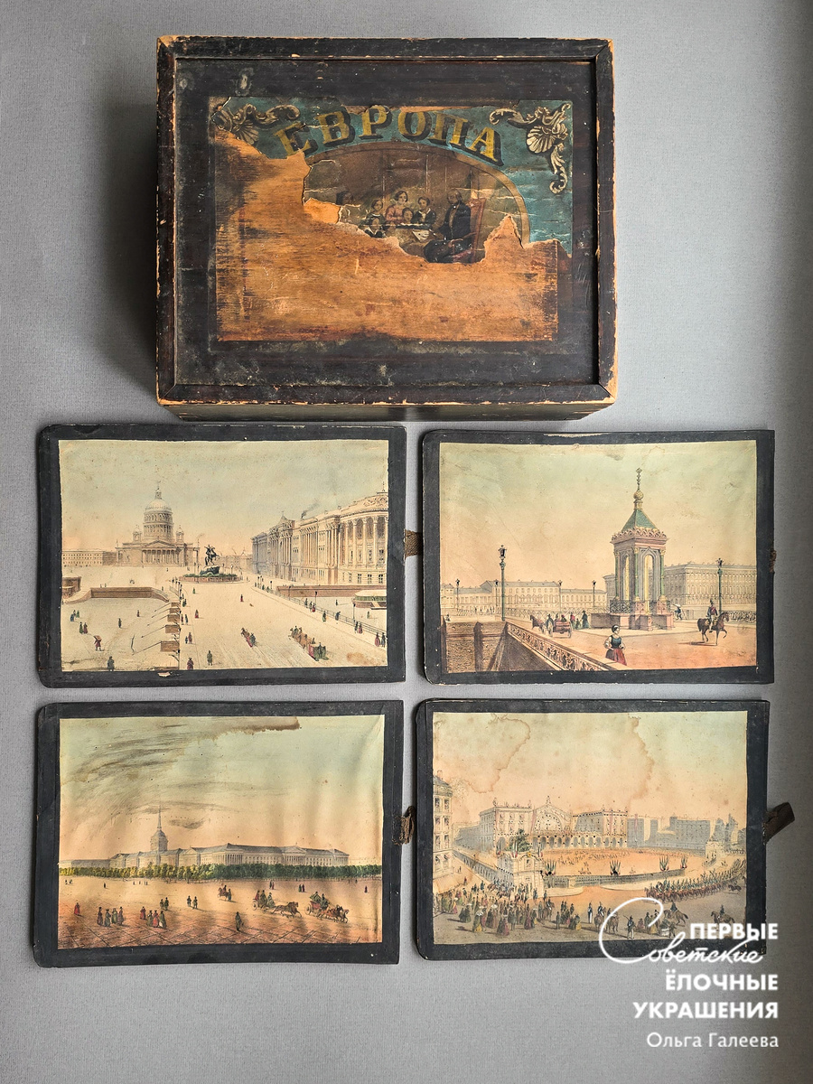 В руки ко мне попала старинная игра. Этикетка сохранилась частично, на ней видна только надпись "Европа". Внутри кробки были бумажные гравюры с видами Парижа и Санкт-Петербурга. В бумаге были пробиты маленькие окошки и закрыты цветной пленкой. Было понятно, что такие иллюстрации нужно смотреть на просвет.
