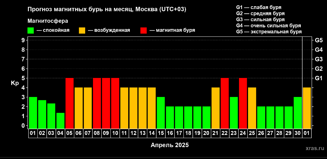 С 15 по 20 апреля, по данным лаборатории солнечной астрономии ИКИ и ИСЭФ, ожидается затишье. А вот 21 апреля геомагнитная активность снова повысится до опасных значений. 22 числа и вовсе ожидается очередная буря. 23 апреля метеозависимых ждет перерыв, ведь 24-го числа снова нагрянет магнитная буря. 25 апреля прогнозируют магнитное возмущение. И, наконец, с 26 числа до конца месяца волгоградцы смогут отдохнут от возмущение магнитосферы.