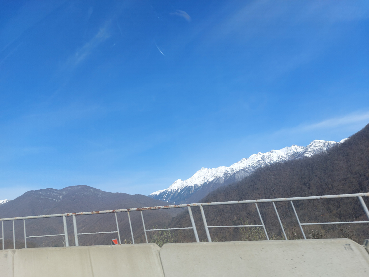 В предыдущей части... Первым делом хотелось посетить белоснежные вершины, которые мы видели из окна автомобиля по приезду в Адлер. На выбор было несколько локаций и канатных дорог: Красная Поляна, Газпром Поляна, Роза Хутор. Выбрали тот, о котором хоть что-то слышали - Роза Хутор. Посмотрел в интернете, где посадочные площадки на канатку и забил в навигатор "Горная олимпийская деревня". Программа выдала маршрут, через 35 минут должны быть на месте. Дорога конечно весьма живописная, проходит в долине реки Мзымта, а вокруг горы. Доехав до конечной точки (а это высота 1100 метров), оказалось что нужно пройти КПП, причём с досмотром автомобиля, который обнюхивает служебная овчарка. Ситуация немного ввела в ступор. Я сказал парню с автоматом, что нам нужно просто попасть туда и показал на проходящие на верху кабинки. "Тогда вам лучше оставить машину на стихийной парковке возле КПП, а то встрянете на 2 рубля и идти пешком" - дал добрый совет автоматчик. Платить такие деньги желания не было,