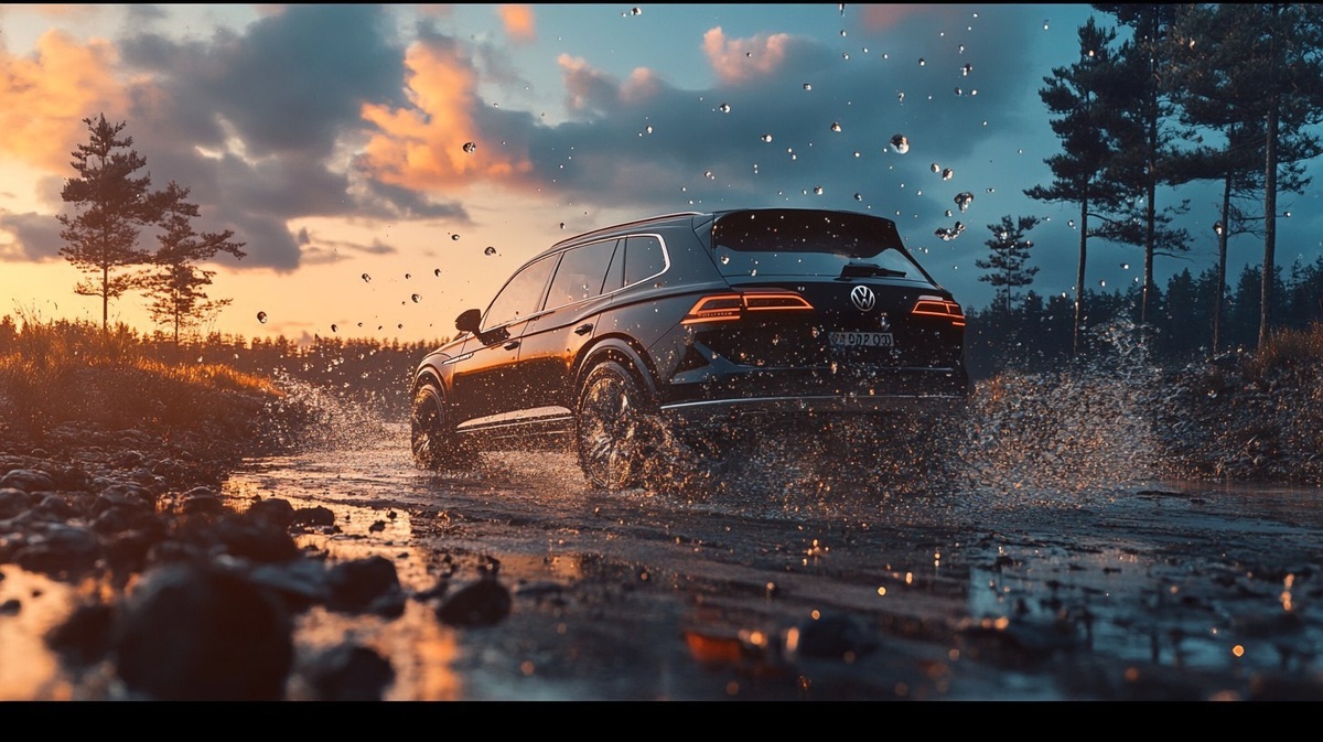 Создано на основе запроса: shot of a volkswagen tayron suv driving in a abstract environment with little vegetation