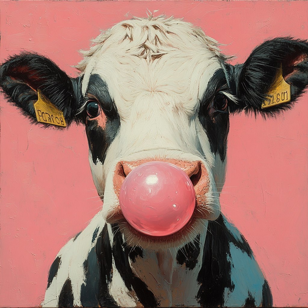 Создано на основе запроса: white and black spotted cow blowing bubble gum