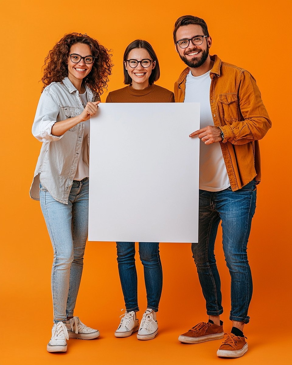 Создано на основе запроса: A team of three middle-aged people, smiling, holding a blank white poster in the style of a mock-up, one of them is pointing at the poster. The orientation of the poster is portrait. Orange studio background