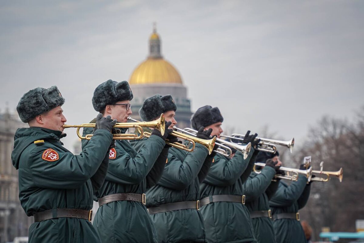 На Дворцовой площади прошла репетиция военного оркестра к параду Победы. В тренировке приняли участие 500 человек.