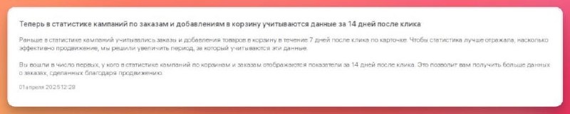 ВБ начал менять период атрибуции в рекламной статистике, теперь заказы и добавления в корзину отражаются не за 7 дней, а за 14 после клика по рекламной карточке.