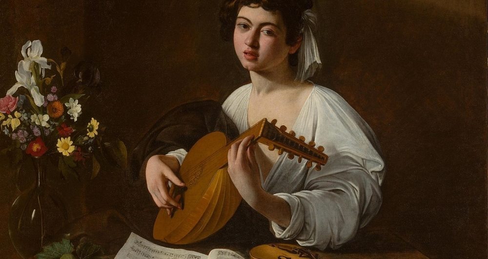 Томный юноша смотрит на нас, но мысли его далеко. Вялые пальцы замерли над струнами лютни, неспособные выбрать нужный аккорд. На столе – брошенная скрипка, под ней – нотная тетрадь. В ней различимы части басовой партии из мадригала Якоба Аркадельта «Voi sapete ch’io vi amo» («Вы знаете, что я люблю вас»). Букет цветов и фрукты довершают картину. Мысль о скрытом в картине послании – первое, что приходит в голову. Послание, ясное дело, любовное. Но кому? И – не менее важный вопрос! – от кого? Ведь не только имя изображенного, но и пол вызывают сомнения. Первый биограф Караваджо, Джованни Беллори, утверждал, что изображена девушка. Этой ошибкой он положил начало целой нелепой традиции: в нескольких описания семнадцатого века картину называют «Лютнисткой», и посетители Эрмитажа и сегодня нет-нет, да и заглянут в глубокий вырез, в попытке решить гендерную загадку… Никакой загадки нет, на самом деле. И думается мне, тот самый глубокий вырез Караваджо написал специально, чтобы у зрителя не во