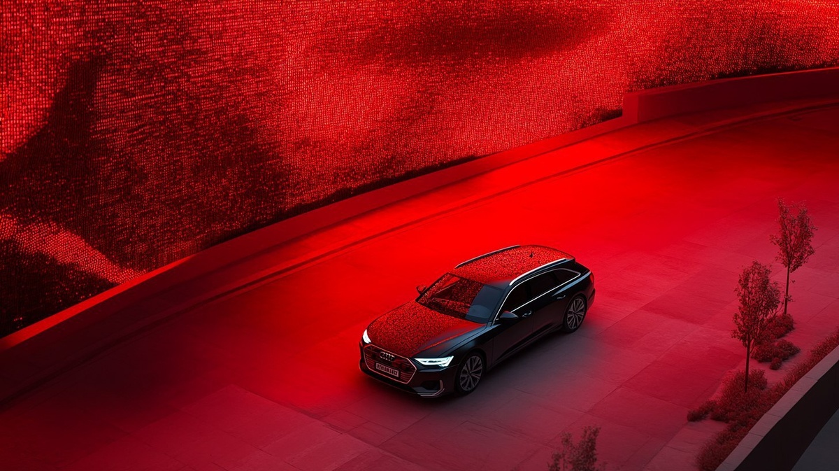 Создано на основе запроса: drone shot of a audi a6 e-tron avant during night in front of a huge red shape like architecture, abstract no