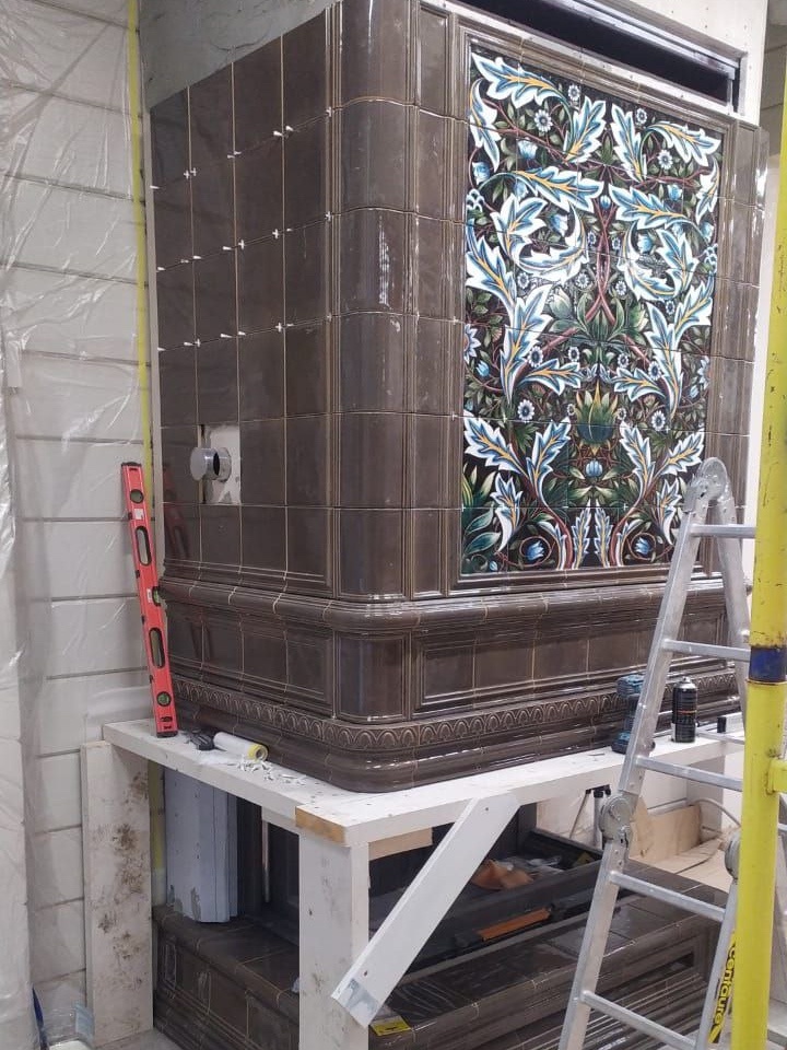 Камин с изразцовой плиткой ручной работы от Сeramica decor стал настоящим акцентом интерьера. На фронтальной части — панно с дубовыми листьями, отсылающее к фамилии владельцев дома. Дуб — символ долголетия, плодородия и благородства. Такая деталь делает пространство не только красивым, но и наполненным смыслом. Дизайн интерьера: владельцы дома при участии Алексея Комкова @planerint.ru.