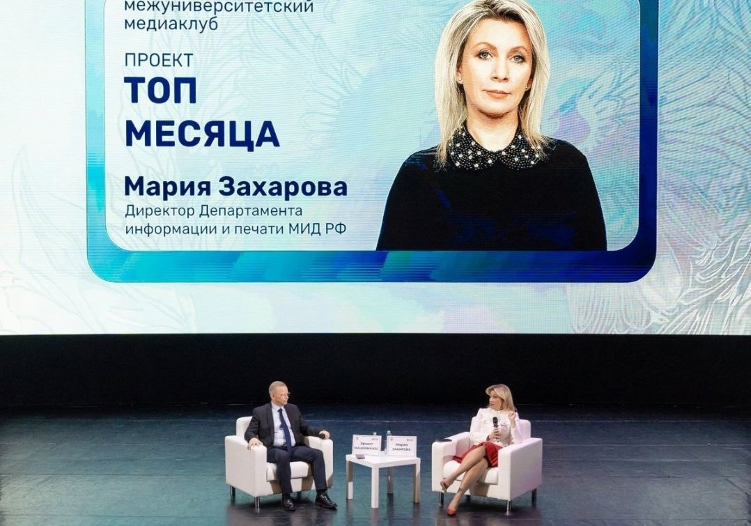 24 марта 2025 года в Конгресс-центре РЭУ им. Плеханова директор Департамента информации и печати Министерства иностранных дел РФ Мария Захарова встретилась со студентами. Встреча состоялась в рамках проекта «ТОП месяца» – межвузовского студенческого медиаклуба, организованного по инициативе директора ИПАМ Эрнеста Мацкявичюса. На мероприятии присутствовали представители НИУ МГСУ: заместитель ректора — директор проектного офиса программы «Приоритет-2030» Наталья Желанова, руководитель СММ-направления университета Дарья Колесникова и студенты, ответственные за информационную политику медиаресурсов активов строительного университета. Четыре студентки НИУ МГСУ приняли активное участие в мастер-классах и других мероприятиях межвузовского студенческого медиаклуба. В ходе мероприятия состоялся круглый стол под председательством директора Департамента информационной политики и комплексной безопасности Минобрнауки России Андрея Толмачева. Во время круглого стола была организована дискуссия «Роль