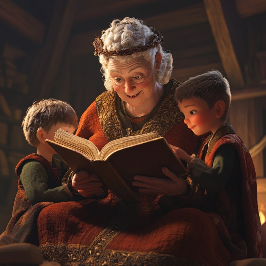 Создано на основе запроса: grandma dressed as boudica reading to her grandchildren, pixar style