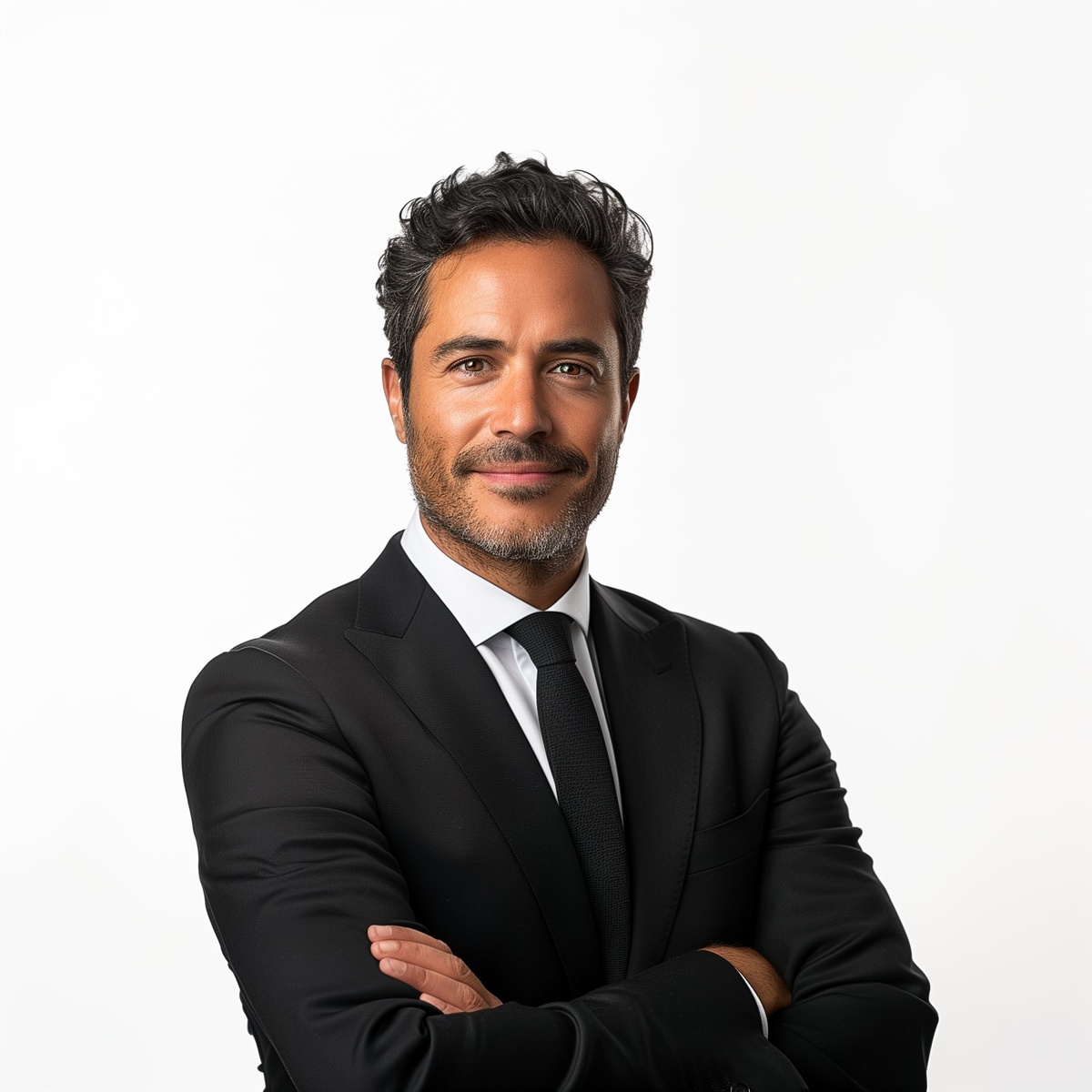 Создано на основе запроса: Professional photo portrait of a 35-year-old Greek man wearing a black suit and tie with arms crossed in front, smiling on white background, smart lighting and professional color grading.