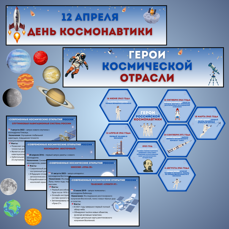 Такой формат занятия позволит детям не только узнать важные факты о космосе, но и почувствовать сопричастность к истории великих открытий. А если вы хотите сэкономить время на подготовке, скачивайте готовые материалы для оформления кабинета здесь по ссылке.