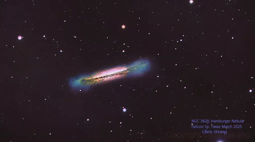 Галактика NGC 3628 На этом снимке запечатлена удивительная галактика NGC 3628, также известная как "Гамбургер" из-за своего необычного вида. Она относится к спиральным галактикам и расположена в созвездии Льва, примерно в 35 миллионах световых лет от Земли. Галактика видна с ребра, поэтому её диск кажется тонкой полосой, пересечённой тёмными линиями пылевых облаков, придающими ей сходство с космическим бутербродом. По краям заметны слабые звёздные рукава, а вокруг — рассеянное свечение из звёзд и межзвёздного газа. Фото передаёт завораживающую красоту и масштабы Вселенной, напоминая, что даже в глубинах космоса можно найти нечто знакомое — например, гигантский "галактический гамбургер".