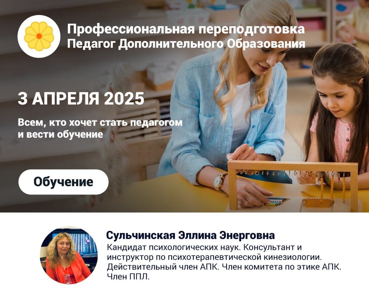 Дорогие друзья!🌿 Приглашаем вас на профессиональную переподготовку "Педагог дополнительного образования" ☀️ Программа начинается 3 апреля 2025 в 10 ч. Длится 4 месяца. ☝️ Программа дает возможность успешно преподавать в организациях дополнительного образования и вести собственную преподавательскую деятельность В рамках программы Вы узнаете: 💫 О специфике сферы дополнительного образования, 💫 Об особенностях организации учебного процесса и создания методического обеспечения для различных категорий учащихся (дети, взрослые. подростки). ❗️На программу принимаются лица с высшим или средним специальным образованием Подробнее можно узнать в личных сообщениях группы ВК или по ссылке — https://kinesioportal.ru/events//12175.php