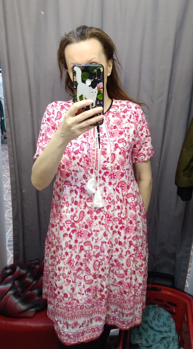 Здравствуйте, всё-таки с цифрами я не дружу вообще. 2 апреля муж поздравляет меня, а я не пойму с чем это, что за радость нас посетила. Я ещё посмеялась, что наш праздник был первого апреля, то есть день дурака😅. А оказывается, что нашему браку уже 26 лет, так нехило получается)) и на данный момент это половина моей жизни!! Беда с цифрами и датами у меня, вот так и живу, и не помню даже сколько денег в кошельке, помню, что мало и хотелось бы больше, тут ошибиться невозможно🤣. Обзор из Столичного гардероба, всё можно было купить со скидкой 80%. Цены пишу полные. Очень милое платье, как любила я эти мелкие узорчики, так и продолжаю их любить)). Платье отрезное под грудью, небольшая горловина на завязках и довольно пышный подол. Небольшая такая цена. И хороший состав. То ли платье, то ли туника, мне по длине явно платье. Прямая модель с застежкой во всю длину, сшито как длинная блузка. 100% вискоза. Комбинированное платье очень тёмного синего цвета с сочетанием полосок и цветов. Платье