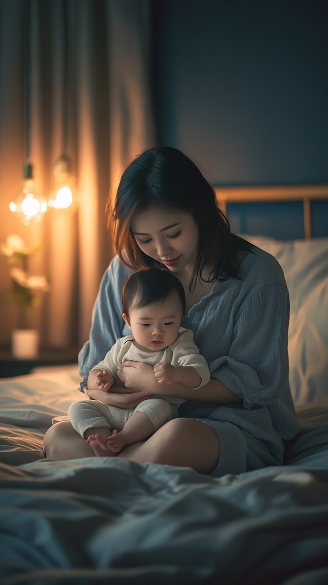 Создано на основе запроса: Asian mother sitting on a bed, gently holding her baby in a nurturing and intimate moment, soft natural lighting