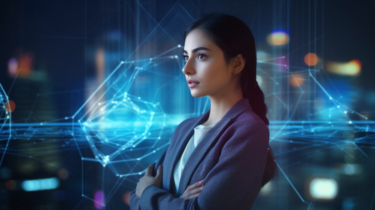 Создано на основе запроса: A young female cybersecurity expert standing confidently in front of a holographic interface, glowing AI elements