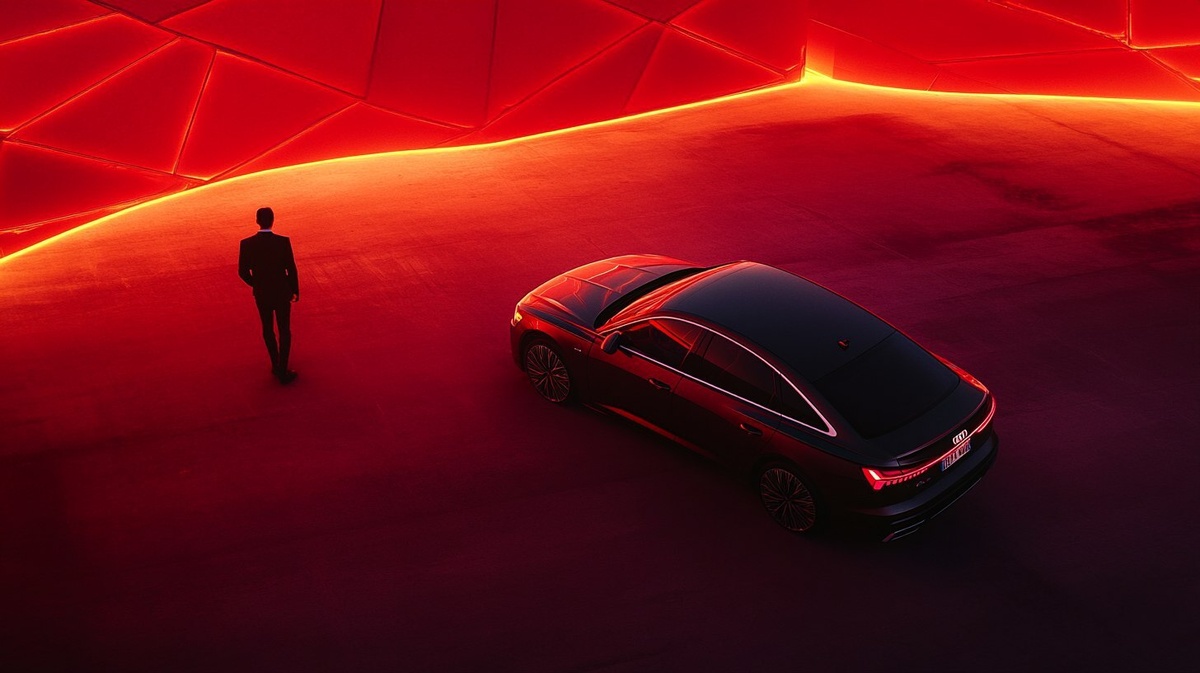 Создано на основе запроса: drone shot of a audi a6 e-tron avant during night in front of a huge red shape like architecture, abstract no architecture, the audi a6 e-tron avant is driving trough a void like urban environment with the bright LED Lights illuminating the night environment while a man is watching after the car, super high quality lots if details, hyper realistic