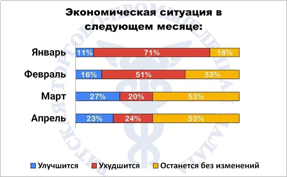 В апреле бизнес Кировской области ожидает от экономики стабильности. Об этом говорят итоги ежемесячного опроса «Бизнес-прогноз» от Вятской ТПП. О стабильности ситуации сообщили большинство участников — 53%. В то же время ожидающих улучшения снизилась до 24%: это на 3% меньше, чем в марте, а прогнозирующих ухудшение — выросла до 23% за счет перехода числа респондентов из позиции «Улучшится» в позицию «Ухудшится». — В текущих условиях мы видим ряд факторов, требующих внимания: высокие ставки по кредитам, тормозящие активность среднего и малого бизнеса; изменение не в лучшую сторону покупательной способности населения (разрыв реальных доходов и реальной инфляции); плюс апрель и май традиционно в течение года непростые месяцы по извлечению выручки в нашем секторе, — отметил ключевые факторы, повлиявшие на результаты прогноза, директор гостиницы «Спутник» Иван Степанов. Фото: тг-канал ВТПП.