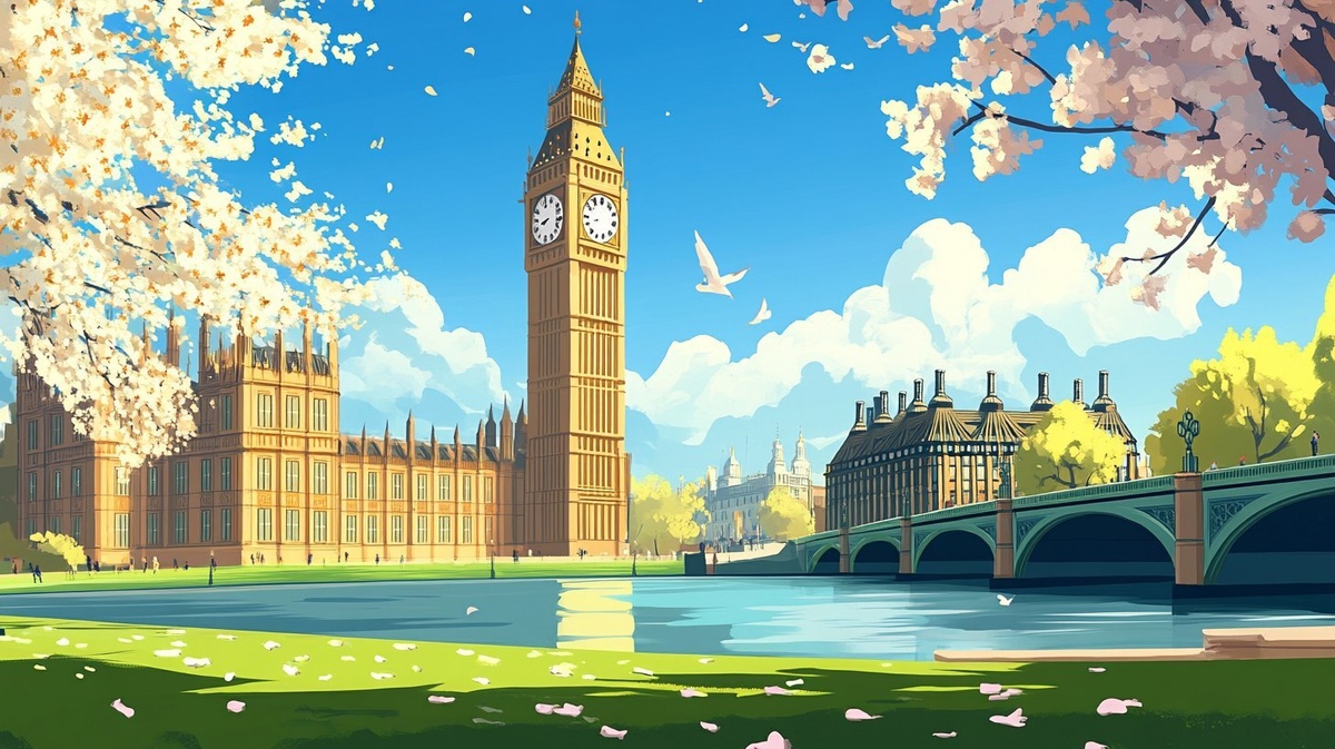 Создано на основе запроса: A cartoon Big Ben clock in spring weather in a green space full of beauty and the tower is fully visible and the