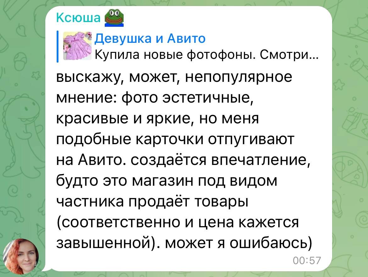 #интересное_мнение Решила ответить, чтобы видели все. Опытные продавцы не согласны с этим. Они говорят, что: 1️⃣ Когда цена на одну вещь плюс-минус одинаковая, то более эстетичные фотографии всегда будут в выигрыше, и соответственно охотнее купят у вас, чем у другого продавца с некрасивыми карточками. 2️⃣ Магазинные объявления хоть и с красивыми фото, но их легко отличить от частных продавцов по названию профиля и более высокой цене. Лично я считаю, что такое мнение про красивые фотки, действительно, есть. Я сама раньше обращала внимание на более простые фото, которые видно, что сделаны дома. Но вместе с тем, совсем трэшовые картинки, сделанные на полу или цветастом ковре, тоже пролистывала. Считаю это лень продавца и неуважение к покупателю. Сейчас просто знаю, что есть разные люди и уровень замороченности у всех тоже разный 😂 Ну и любая теория должна подтверждаться практикой. Надо тестировать, делать по-разному, находить баланс. Я вот попробовала, мои детские вещи, сделанные на