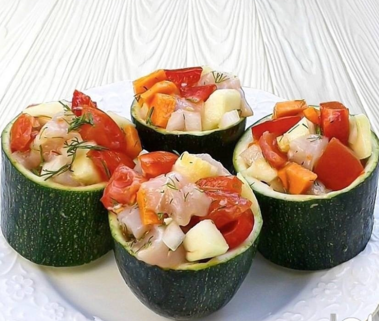 Ингредиенты: Кабачок – 2 шт. Куриная грудка – 200 гр. Морковь – 1 шт. Лук – 1 шт. Помидоры – 1 шт. Масло оливковое – 1 ст.л Болгарский перец – 0.5 шт. Зелень Соль, перец по вкусу Приготовление:⠀ Кабачок нарезаем дольками по 5-6 сантиметра. Вырезаем середину с косточками. Все овощи нарезаем на мелкие кубики. Куриную грудку нарезаем небольшими кусочками и добавляем к овощам. Добавляем соль, перец, зелень и оливковое масло, хорошенько перемешиваем. Фаршируем кабачок получившейся массой. Ставим в разогретую до 180 градусов духовку на 40 минут, потом достаем и посыпаем тертым сыром и ещё на 10 минут в духовку. Приятного аппетита! На 100грамм - 35.34 ккал Б/Ж/У - 2.5/0.79/4.48