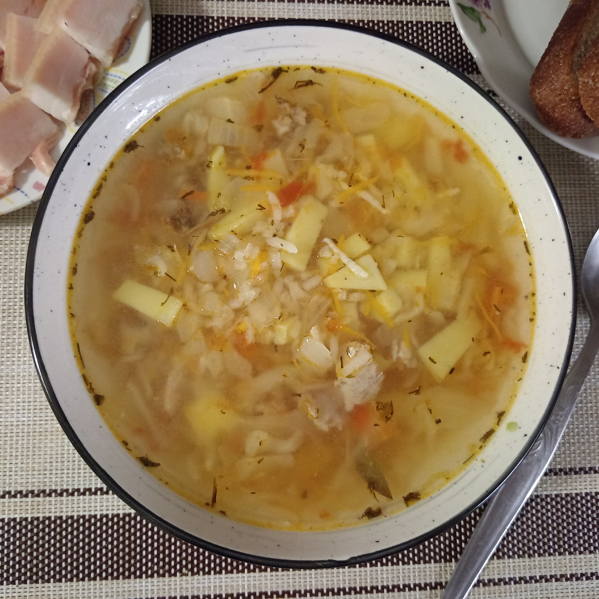Вашему вниманию предлагается суп "Капустняк"! Это блюдо украинской и южно-русской кухни. Приготовьте новый, но по сути очень знакомый супчик вместе со мной! Я говорю что харчо это жидкий плов, а вот капустняк это жидкие голубцы! Готовим традиционно, начинаем с бульона. Варим в 4-х литровой кастрюле. Его приготовим накануне, отделим мясо от костей. Теперь подготовим овощи и рис. Рис для супов рекомендую использовать пропаренный, так он дольше сохранит форму, и не разбредется. И хорошо его замочить хотя бы за час. Сначала шинкум свежую капусту и отправляем в бульон вариться. Варим 20-30 минут на медленном огне. Пришло время добавить квашенную капусту. Готовим ещё 20 минут. Добавляем картошку. Некоторые советуют отваривать картофель отдельно, разминать в пюре и добавить в суп. Тем временем приготовим зажарку. Поджарим лук и морковь. Добавим помидоры или томат. Протушим. Добавим 2 столовых ложки уксуса и 1 столовую ложку сахара. Добавляем замоченный рис в наш суп. Добави