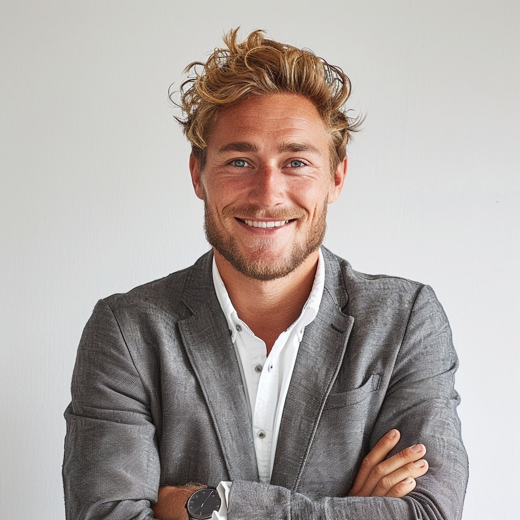 Создано на основе запроса: A stylish blond man in a grey suit jacket stands with his arms crossed in front of him and smiles on a white