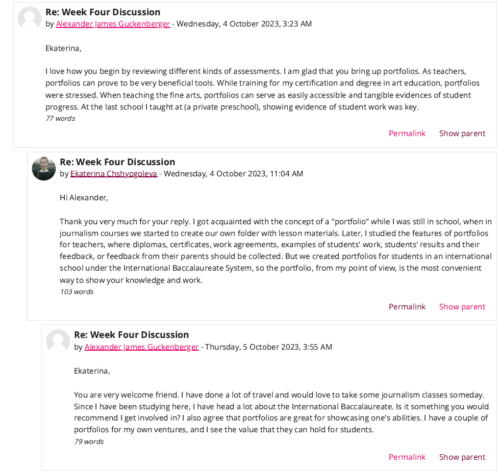 It is your responsibility to respond to three classmates by providing comments, asking questions, or having a conversation about their main post. Feedback should be appropriate, meaningful, and helpful. For instance refer to how your own experience supports/contradicts the opinions developed by your peers. If you think they are too general or not rooted enough in personal experience, you may also ask for more detailed examples supporting these opinions. In particular make sure that the examples provided are properly referenced and that you are able to access them. Overall, your comments should contribute positively to the conversation by broadening or clarifying it. Feedback should be at least 3-4 complete sentences.