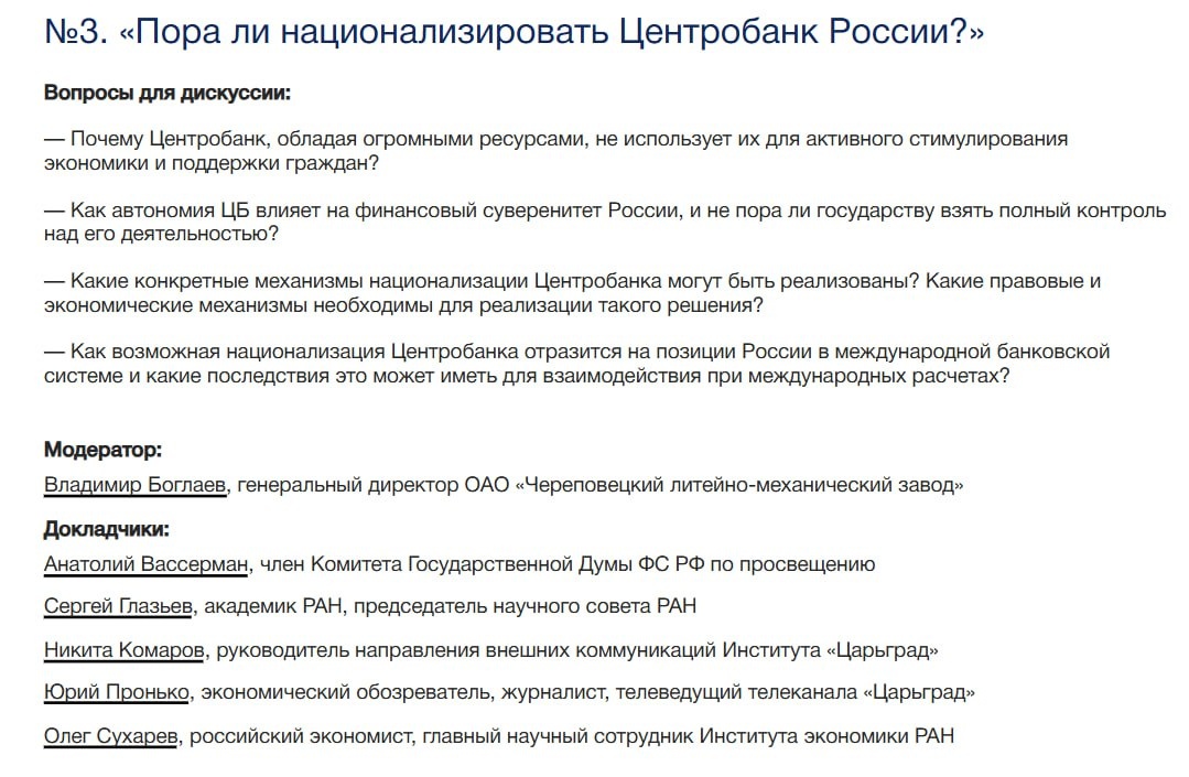 ⚡️ На Московском экономическом форуме сотрудники Царьграда выскажутся за национализацию Центробанка