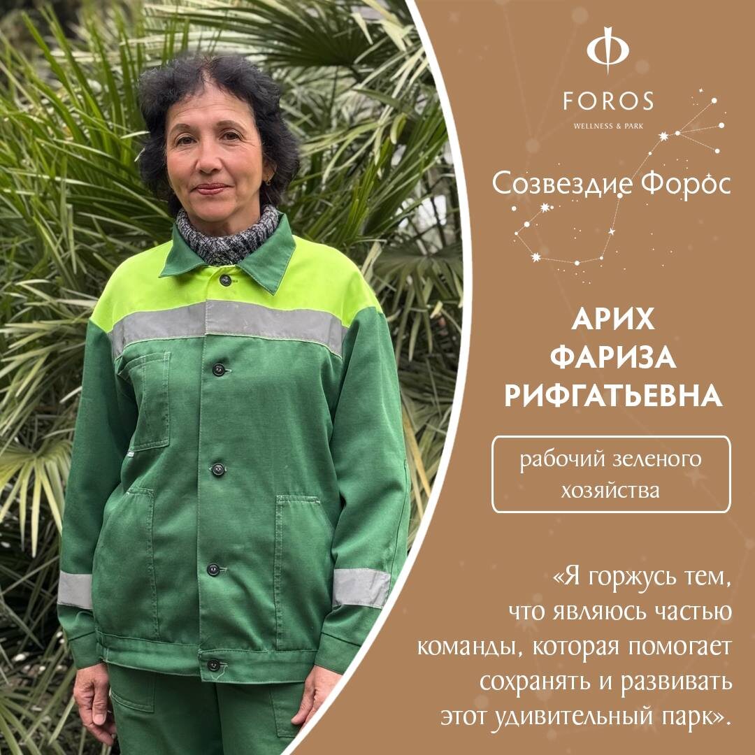 👋Знакомьтесь! Арих Фариза Рифгатьевна — рабочий зелёного хозяйства. 💫Профессиональный багаж В профессии с 2019 года. Работа в парке приносит удовольствие, здесь Фариза Рифгатьевна нашла своё призвание. 💫Немного из личного Фариза Рифгатьевна обожает читать художественную литературу. Любит путешествия по разным уголкам Крыма. А еще вышивает удивительные картины бисером. 💫Взгляд со стороны Замечательный, незаменимый сотрудник, с коллективом всегда в дружеских отношениях, позитивный и отзывчивый человек. Очень часто отдыхающие благодарят за проделанный труд и создание красоты в парке. «Моя работа позволяет мне заботиться о растениях, создавать уютные уголки для отдыха и радовать посетителей. Кроме того, эта работа помогает мне оставаться активной и энергичной. Она требует движения, творчества и внимания к деталям, что делает каждый день уникальным и интересным» — говорит Фариза Рифгатьевна.