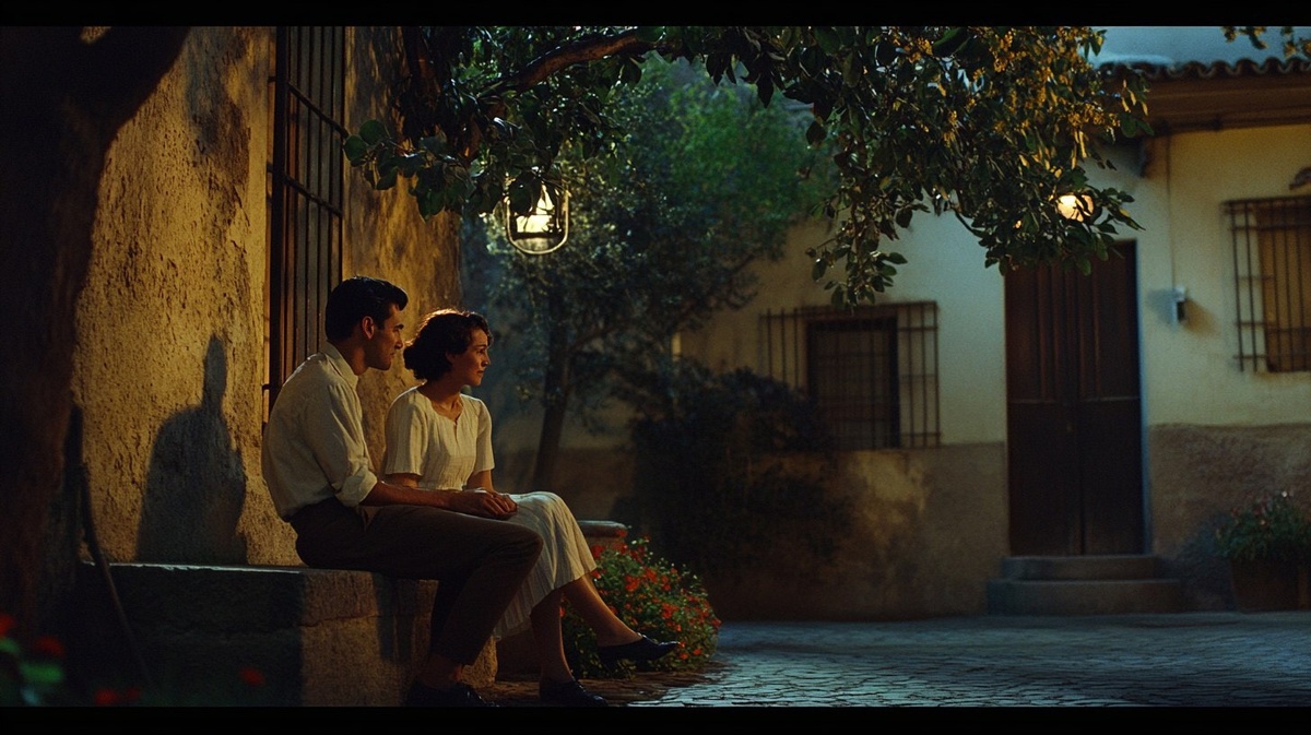 Создано на основе запроса: A peaceful courtyard at night on the outskirts of Valencia, Spain, shortly after World War II. The setting is quiet and serene, bathed in soft moonlight. Two people sit closely on a stone bench under a large tree: Captain Gabriel Torres, now stronger and calm, and Lieutenant Inés Ramírez, no longer in uniform but in a simple dress, her dark hair loose. Gabriel, mid-40s, with a gentle expression and warm eyes, reaches out to hold Inés’s hand