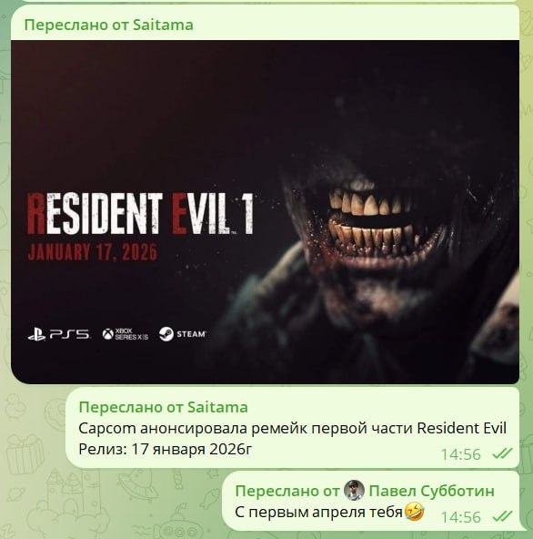 Смотрите не ведитесь там. С 1 апреля тех кто поверит в ремейк 1 части Resident Evil :D