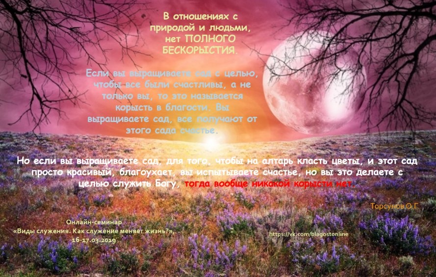 В отношениях с природой и людьми, нет полного бескорыстия. Если вы выращиваете сад с целью, чтобы все были счастливы, а не только вы, то это называется корысть в благости. Вы выращиваете сад, все получают от этого сада счастье. Но если вы выращиваете сад, для того, чтобы на алтарь класть цветы, и этот сад просто красивый, благоухает, вы испытываете счастье, но вы это делаете с целью служить Богу, тогда вообще никакой корысти нет. ✅ Олег Геннадьевич Торсунов, из онлайн-семинара «Виды служения. Как служение меняет жизнь?», 16-17.03.2019.